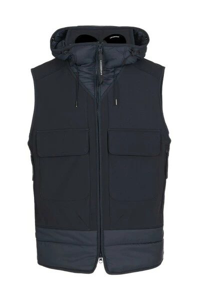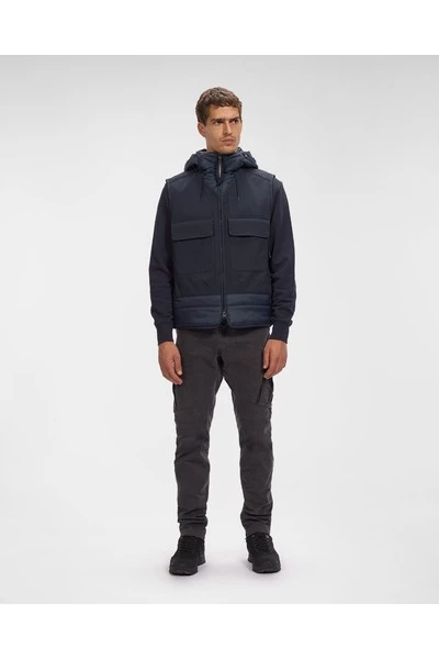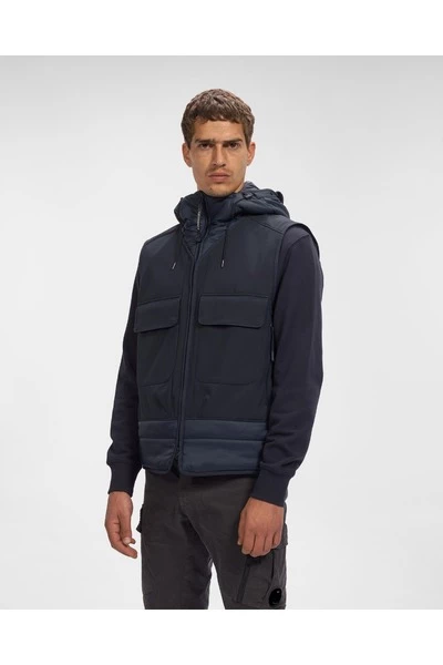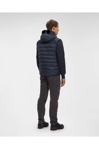 Een gewatteerd vest gecombineerd met de onderscheidende kap met bril, complete ritssluiting en voorzakken met veilige sluiting. Het kledingstuk is gemaakt met C.P. Shell-R, een elastisch nylonstof gepatenteerd door het merk gemaakt met volledig gerecyclede draden om duurzame constructie te garanderen. Een membraanbestendig tegen de elementen wordt gecombineerd met een lichtgaas om een ​​veelzijdige entertainmentlaag te creëren die de belofte -beschermingseigenschappen niet in gevaar brengt. – Gerecycled nylon – nylonmengsel met vulling – brilkap – Volledige ritssluiting – Voorzakken met veilige sluiting