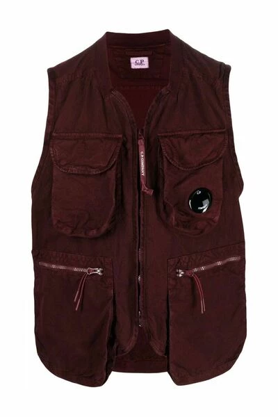 C.P. Bedrijf Sweaters Bordeaux Logo-patch Zip-Up Gilet van C.P. Bedrijf met wijnrode, katoenen mix, logo-patch naar de voorkant, aan de voorste ritssluiting, mouwloos, twee borstklepzakken en twee zakken zip-fasterende zakken.
