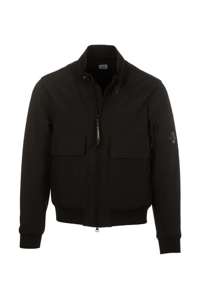 C.P. Bedrijf Coats Black Jacket C.P. Shell – Bomber Short R in zachte schaal stof opstaan kraag geribbelde bodem volledige zip sluiting functionele voorzakken mouwzak met lens