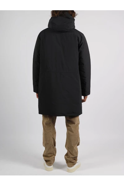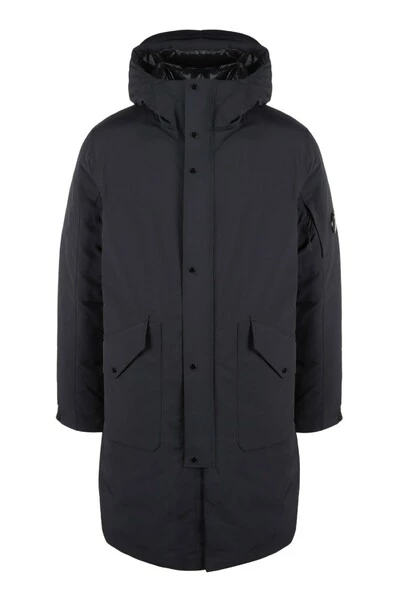 C. P. Bedrijf gevoerde lange jas, in gerecycled nylon. – FW22 – Drawstringkap – Zip Clousure met flap en druk op studs – voorzakken met klep – Zipzak op linker mouw met C. P. Bedrijfslens detail – verstelbare manchetten met snapknop – gemaakt in Myanmar – 100% polyester – 100% polyester