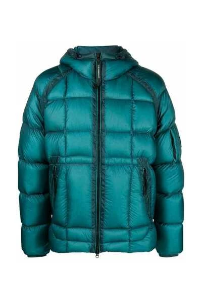 C.P. Company Coats Blue Logo-Patch Gedeveded Jacket van C.P. Bedrijf met opgevulde ontwerp, down-veer vulling, logo-patch bij de mouw, trechterhals, aan de voorste zip-bevestiging en benzine blauw.
