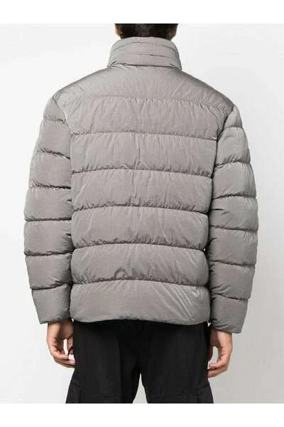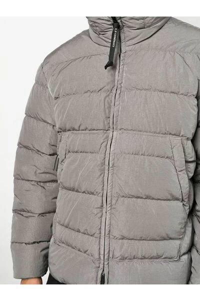 C.P. Bedrijf Coats Gray Pabded Zip-Up Down Jacket van C.P. Bedrijf met lichtgrijs, opgevuld ontwerp, down-veer vulling, trechterhals, ritssluiting aan de voorkant en lange mouwen.