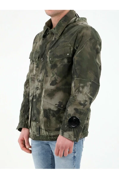 Militaire groene 1000 Miglia jas met all-over camouflagepatroon. Het beschikt over Google Hood, voorste knopafsluiting, vier flapzakken met knopen aan de voorkant, C.P. Bedrijfslens Zwart detail op details van de linker mouw en knoopers op nek, manchetten en zoom. Het model is 184 cm lang en draagt maat 50.