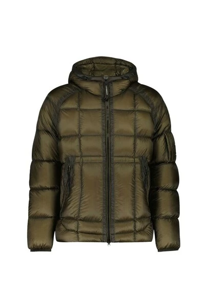 Short Down Jacket Khaki: – Nylon – Witte eend naar beneden en veren vullen – recht gesneden – Lange mouwen – Hoge kraag met verstelbare kap – Centrale ritssluiting met dubbele schuif – een zak met bril op de linker mouw – 2 ritssluiting kangoero -zakken – Verstelbare basis