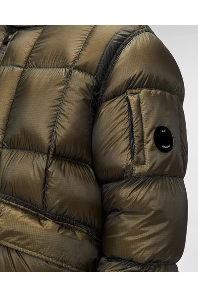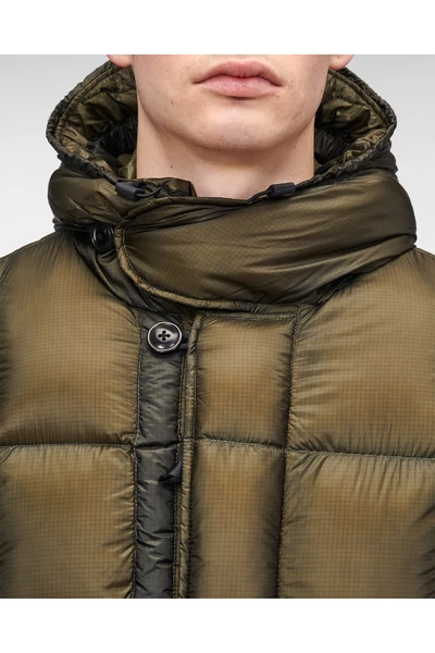 DD Shell Down Jacket Green DDown Doc door CP Company Achter kap jas met verstelbare trekkoord, zak op de mouw met lens, twee diagonale voorzakken, extra sluiting met knoppen boven de zipcon de lijn D.D. Shell Ripstop gebruikt een externe Matt Nylon -laag 7 geld. Dit dunnere nylon, samen met het directe down -injectieproces, geeft de kledingstukken met veervulling meer zachtheid.