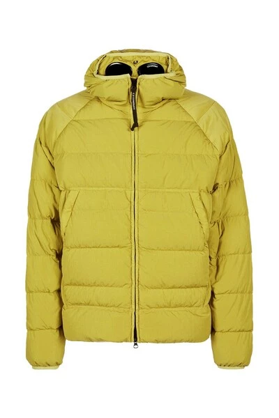 Eco-chrome r kap naar beneden naar beneden bril Jack Golden Palm-Geel Medium Gededed Jacket met volledige ritssluiting, functionele frontale zakken en brilkap. Chrome is de eigenaar van nylon multifilament stof van C.P. Bedrijf. Deze nieuwe versie maakt gebruik van ECONYL®, een geregenereerde nylonvezel geproduceerd met behulp van pre- en postconsumptieafval, zoals visnetwerken. Normale pasvorm