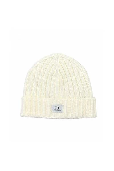 C.P. Company Hoeden Extra Fine Merino Wool Logo Beanie White