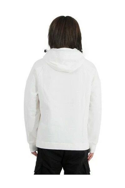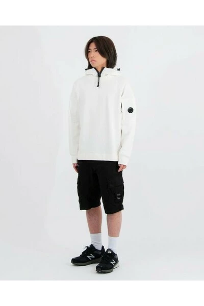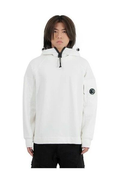 Diagonal Raised Fleece Mixed Pullover Hoodie van CP Company: wit sweatshirt, halve ritssluiting, capuchon met trekkoorden, zak met merklens aangebracht op de linkerarm, elastische zoom en manchetten. Materiaal: Buitenstof: 100% katoen Secundaire stof: 100% polyester Productstijl-ID: 12CMSS115A005086M103 Deze beschrijving is automatisch vertaald.