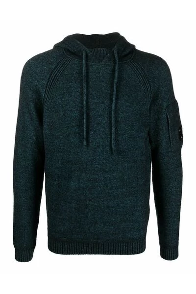 C.p.company blauwe groene wol mix hoodie met geribbelde versieringen en een C.P. Bedrijfslens detail op de linker mouwzak