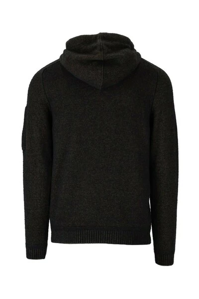 C.P. Bedrijf Hoodie gemaakt van Mélange Green Wool Blend. C.P. Lens aangebracht op de linker mouw, verstelbare kap met trekkoord en geribbelde manchetten en onderkant.