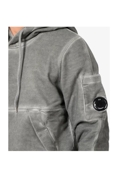 C.P. Bedrijf Sweaters grijs – katoen – kap met trekkoord – voor zakje – compartiment op linker mouw met exclusieve c.p. Bedrijfslens detail – lange mouwen – geribbelde zoom en manchetten