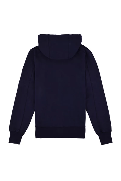 C.P. Bedrijfsblauwe kap met verstelbare trekkoord geribbelde bodem en manchetten Twee voorzakken Volledige zip Sluiting Mouw Pocket met lens