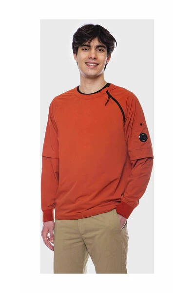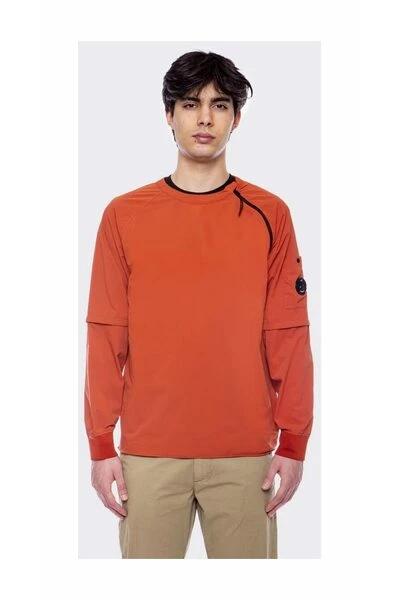 Kreeft-gekleurde sweater. Ronde hals met rits detail op de schouder / mouw. Zakje met drukknoop en iconische lens op de arm. Technische iconische merk stof.