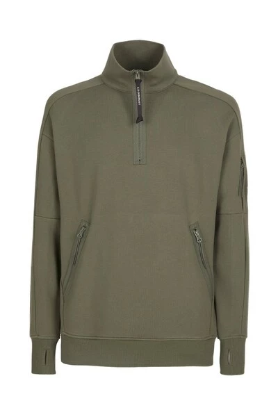Deze trui is gemaakt in ons diagonale reliëf fleece, een half ingesloten krullend katoen met absoluut comfort en grote robuustheid. Dit model heeft randen geribbeld aan de polsen en zoom, twee voorzakken en een ritssluiting van de sta -kraag. Het detail in de vorm van een bril Glas C.P. Bedrijf verbetert de zak op de mouw.