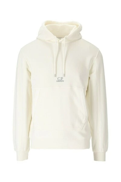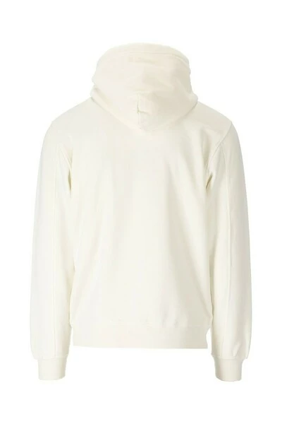 C.P. Bedrijf Hoodie gemaakt van gebroken wit fleece katoen met logo geborduurd aan de voorkant. Kap met trekkoord, kangoeroe -zak, manchetten en onder in stretchstof.