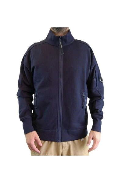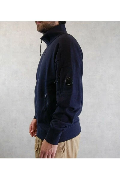 Jersey CP Company Sweatshirt. Navy Zip Blue Sweater. Het model meet 184 cm weegt 80 kg en draagt maat L.