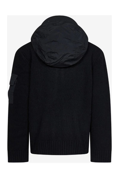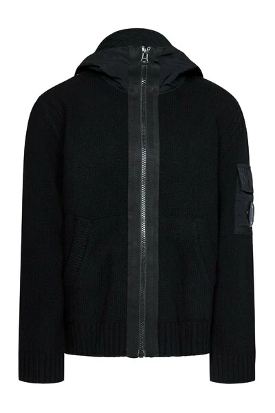 Zwart lambswool zip-up sweatshirt voor jongens met nylon kap en lens detail.