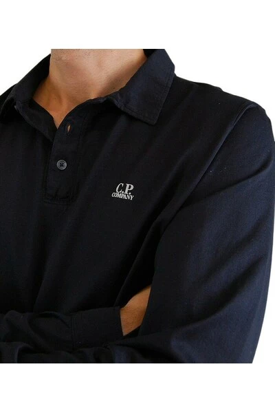 CP Company Polo. Lange sleeved marineblauwe paal. Het model meet 184 cm weegt 80 kg en draagt maat L.