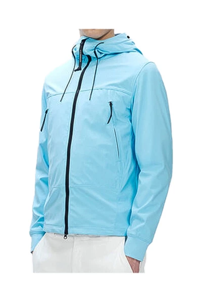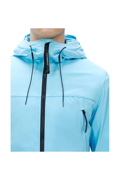 CP Company blauwe softshell jas. Volledige ritssluiting. Zakken met ritssluiting aan de voorkant. Verstelbare capuchon met kenmerkende bril van het merk. Gemaakt van stretch nylon met volledig gerecycled garen. Weersbestendig. Materiaal: buitenkant Stof: 92% polyester, 8% elastaan / spandex Voering: 100% polyamide / nylon Productstijl-ID: 12CMOW001A005968A832 Deze beschrijving is automatisch vertaald.