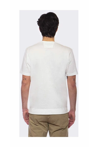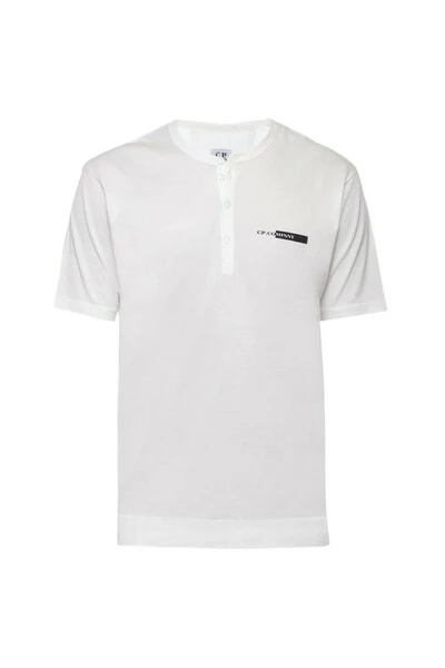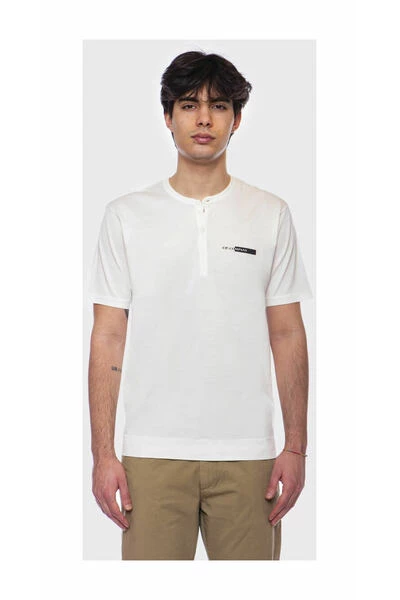White Crew-hals T-shirt, kleine halslijn met knopen. Logo op de borst. Normale pasvorm. Massief kleurenpatroon in zacht katoen, comfortabel en perfect voor seizoensgebonden uiterlijk.