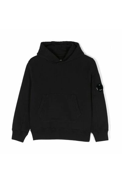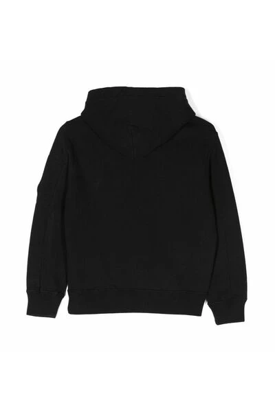C.P. Bedrijf Sweaters Black Lens-Patch Long-Sleeve hoodie van C.P. Bedrijfskinderen met jetzwart, katoen, jersey gebreide, logo -patch bij de mouw, slouchy truitstringkap, lange mouwen, mouwzipzak, voor zakje en rechte zoom.