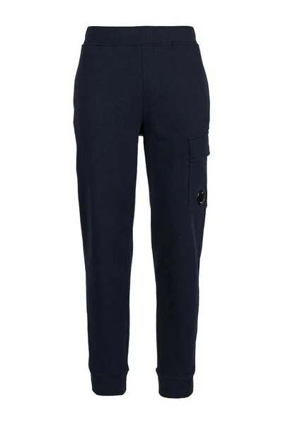 C.p. Bedrijf Diagonal Opgeheven fleece Sweatpants gemaakt van marineblauw katoen. Verborgen zijzakken, Maxi Cargo Pocket met iconische c.p. Lens op het linkerbeen en verstelbare geribbelde elastische tailleband met trekkoord. Manchetten aan de onderkant.