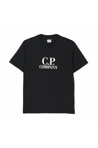 C.P. Bedrijfst-shirts en Polos Black Teen Logo-Print T-shirt van C.P. Bedrijfskinderen met middernachtblauw, katoen, Jersey Knit, logo print naar de voorkant, bemanningslid en korte mouwen.