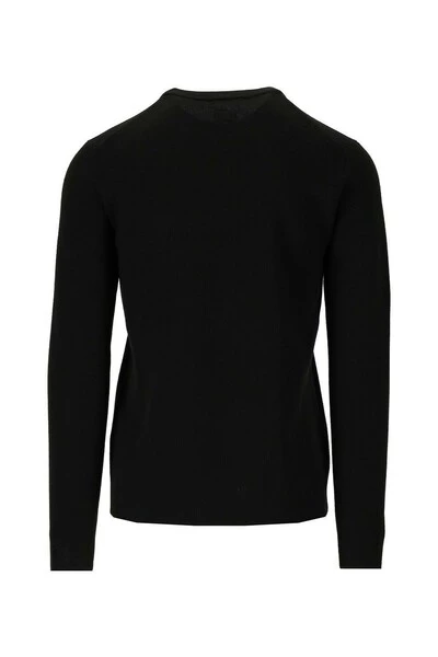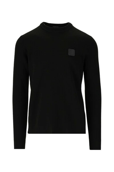 Jumper door C.P. Bedrijf gemaakt van zwarte wolmix met logo -patch aan de voorkant, verwijderbaar met klittenband. Geribbelde kraag.