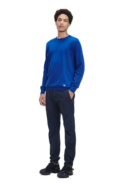 C.P. Bedrijf Crewneck Jumper gemaakt van koningsblauw katoen. Contrasterend logo op de bodem, manchetten en geribbelde zoom.