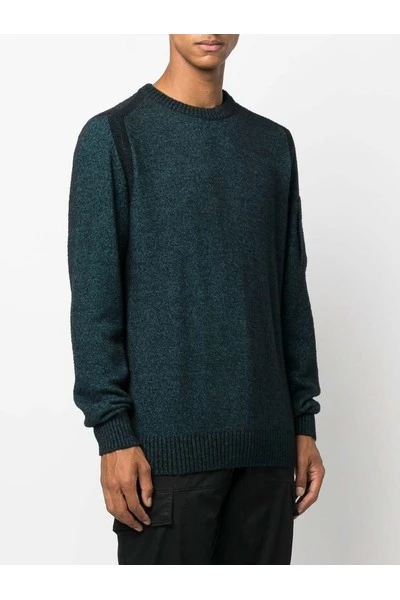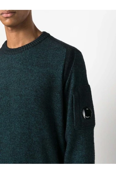 CP Company Sweaters Blue Crewneck Sweater met geribbelde versieringen C.P. Bedrijfslens op de mouwzak geribbelde afwerkingen Het model draagt maat 50 60% polyamide, 40% wol gemaakt in Italië