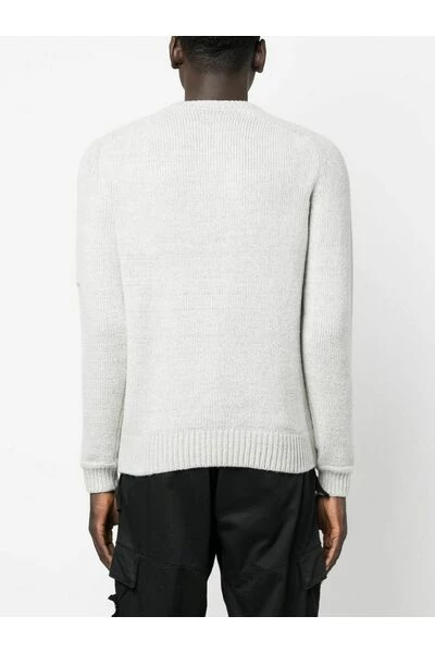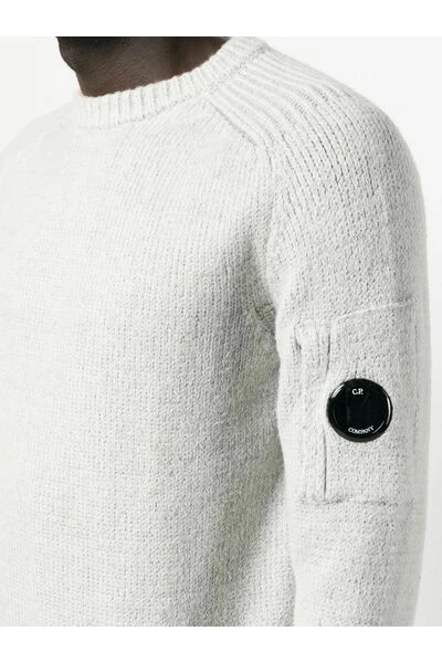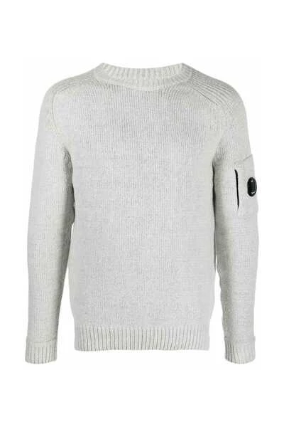 CP Company Sweaters Gray Crewneck geribbelde Hems C.P. Bedrijf Lens Detail op de mouwzak Het model draagt maat 46 67% katoen, 37% polyamide gemaakt in Roemenië
