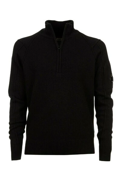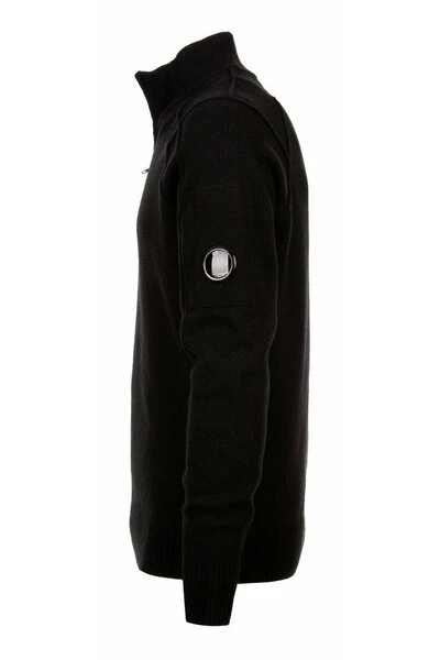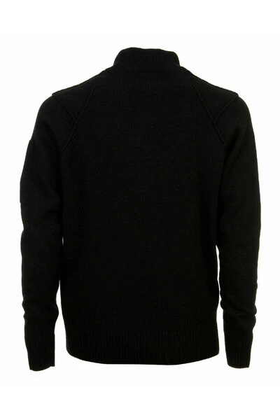 C.p. Bedrijfsmensen trui, hoge kraag met rits, lange mouwen met sleuf en zijlens. Materiaal 80% wol 20% polyamide. Zwarte kleur
