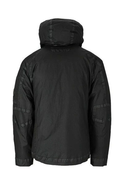 Jas door C.P. Bedrijf gemaakt van donkergrijze gore-tex, een hoogwaardige materiaal dat in staat is om ademend vermogen, waterdichting en weerweerstand te garanderen. De jas bestaat uit twee afneembare stukken: onder een down jas met witte eendendons vulling, met kap en dubbele slider zip; Over een windjack met logo op de borst, zak met iconische C.P. Lens op de linker mouw, voorzakken met knoppen en verstelbare manchetten. Dubbele schuifregelaar Zip Sluiting.