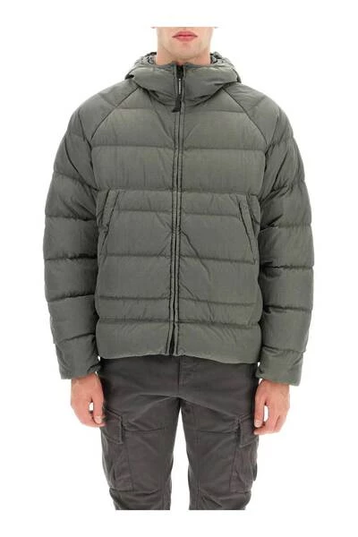 C.P. Bedrijfsvolle jasje in Eco-Chrome R, een weerbestendige eigen stof gemaakt van econyl geregenereerd nylon, gekleed met een metalen afwerking en gevuld met 90/10 grijze eend naar beneden. Dubbele slider ritssluiting, verhoogde kraag met iconische brilkap, klikte ritszakken, raglanmouwen, manchetten en kap afgewerkt met elastische tape, verstelbare zoom. Een pocket met een handtekening C.P. Bedrijfslens detail. Gewatteerde voering met lichtgewicht polyestervulling, één binnenzak. Het model is 187 cm lang en draagt een maat IT 48.