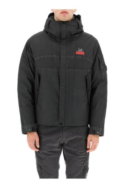 C.P. Bedrijfskap jas in kleding in kledingstukken met Gore-Tex Infinium, een winddichte en waterbestendige technische stof, gedetailleerd met logo-print op de borst en handtekening C.P. Bedrijfslensapplicaties op de mouwzak. Elastische trekstrings bij de motorkap en zoom, dubbele slider ritssluiting, verstelbare snap tab manchetten, zijzakken met bezaaide klep, een binnenzak. Het wordt geleverd met een afneembare binnenste laag in lichtgewicht kledingvergevallen nylon, gewatteerd en naar beneden gevuld, met een vaste kap, ritssluiting en een binnenzak. Het model is 187 cm lang en draagt een maat IT 48.