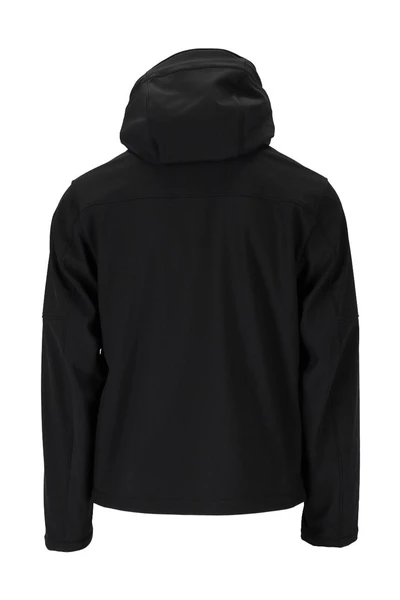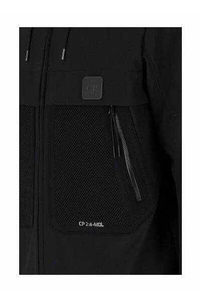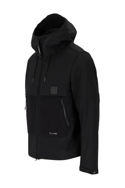 Jas van C.P. S-R zwart, een materiaal met waterdichte en windbestendige eigenschappen. Fleece en mesh interieur. Voorzakken met rits. Logo detail. Verstelbare capuchon. Taille met koord aan de binnenkant. Dubbele schuifritssluiting.