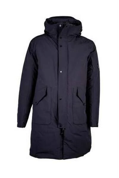 Lange dop met kap, verstelbare trekkoord, zak op de mouw met lens. Twee voorzakken diagonale extra sluiting met knoppen boven de ritssluiting.