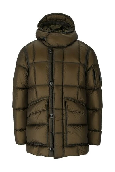 Hooded Down Jacket van C.P. Bedrijf gemaakt van militaire groene DD -shell nylon, waterdicht, ademend en winddicht, met kristalciré -afwerking. Duck Down Poldding. Kap, zoom en taille verstelbaar met trekkoord voor beter comfort. Pocket met rits op de linker mouw versierd met iconische C.P. Lens en flapzakken aan de voorkant. Dubbele schuifregelaar Zip en knoopafsluiting.