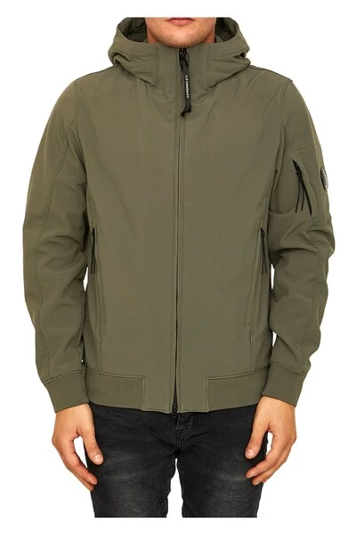 C.P. Shell -jas in militaire groene stof. Het beschikt over kap, tweerichtingszipafsluiting vooraan, twee zakken ritszakken en een zak op linker mouw met c.p. Bedrijfslens detail. Het model is 184 cm lang en draagt maat 50.