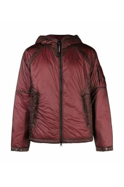 CP Company Coats Bordeaux Zip-Up Hooded Jacket van C.P. Bedrijf met rode, zip-aansluiting aan de voorzijde, twee zakken zip-fasterende zakken, lange mouwen en klassieke kap.