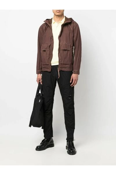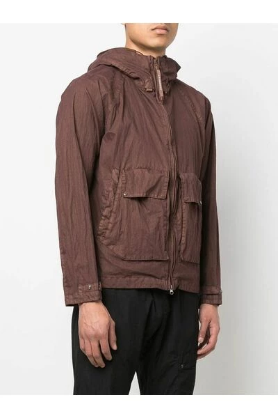 C.P. Bedrijf Coats Brown Goggle-Detail Hooded Jacket van C.P. Bedrijf met een kenmerkende bril detail, klassieke kap, zip -knipbevestiging, lange mouwen, voorklepzak, rechte zoom, donkerbruin en katoen.