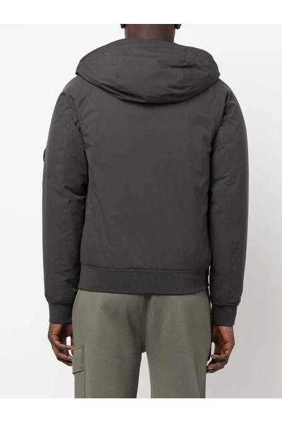 CP Company Jackets Gray Non-afetachelbare kap Volledige ritssluiting Mouw Zip Pocket Veilige voorzakken geribbelde zoom en manchetten Het model draagt maat 46 100% polyester gemaakt in Myanmar