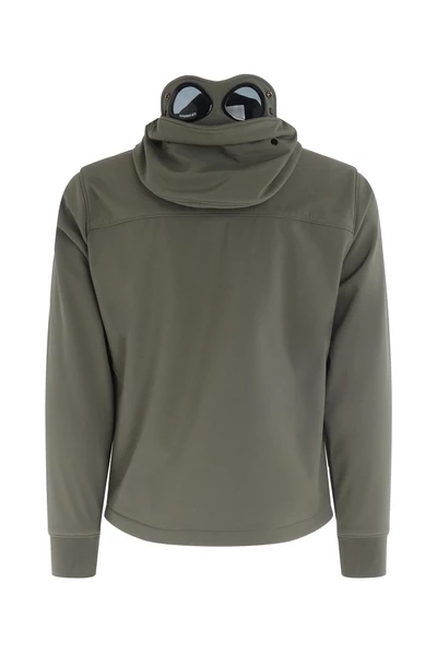 C.P. Goggle -model van jasbedrijf in Green Softshell. Goggle -kap met snelle droogstoflenzen, winddicht en waterbestendige samenstelling: 94% gerecycled stretch polyester, 6% elastan bedrijf kleur: tijm