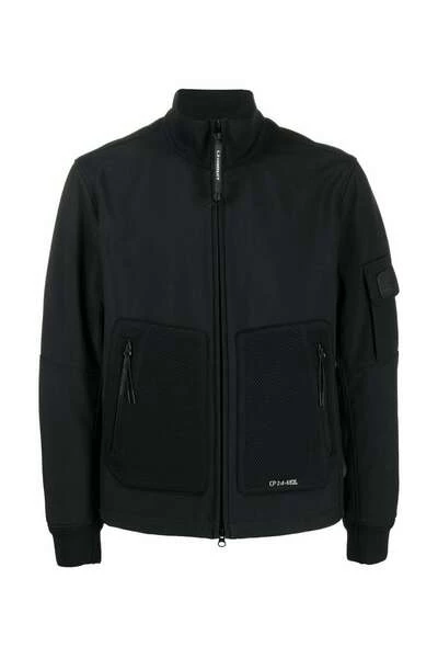 C.P. Bedrijfscapsule Coats Zwart Neopreen Mesh-Pocket Jacket van C.P. Bedrijf met zwart, katoenen, mouwpatje, zip -knipbevestiging, hoge nek, lange mouwen en twee voorste mesh -zakken.