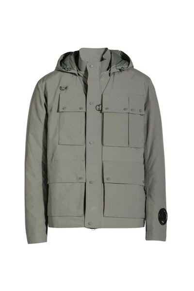 Uitbreidbaar jas intern. Sluiting met zip en knoppen. Karakteristiek lensmotief op de mouw. Kap met trekkoord en vrachtzakken aan de voorkant. Manchetten en rechte zoom. Het model is 190 cm lang en draagt het nieuws. 50.