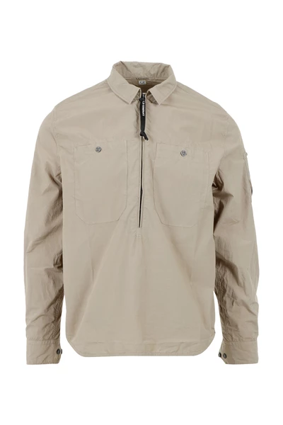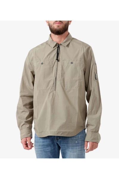 C.P. Bedrijf shirts groen – katoen – klassieke kraag – zakken met borstafsluiting – mouwzak met lensdetail – halve ritssluiting – kledingverven – reguliere fit